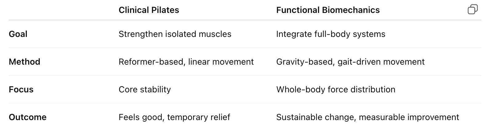 Clinical PilatesFunctional BiomechanicsGoalStrengthen isolated musclesIntegrate full-body systemsMethodReformer-based, linear movementGravity-based, gait-driven movementFocusCore stabilityWhole-body force distributionOutcomeFeels good, temporary reliefSustainable change, measurable improvement
